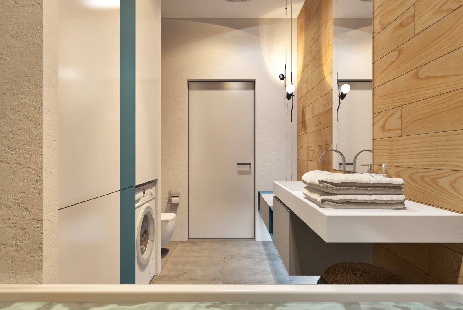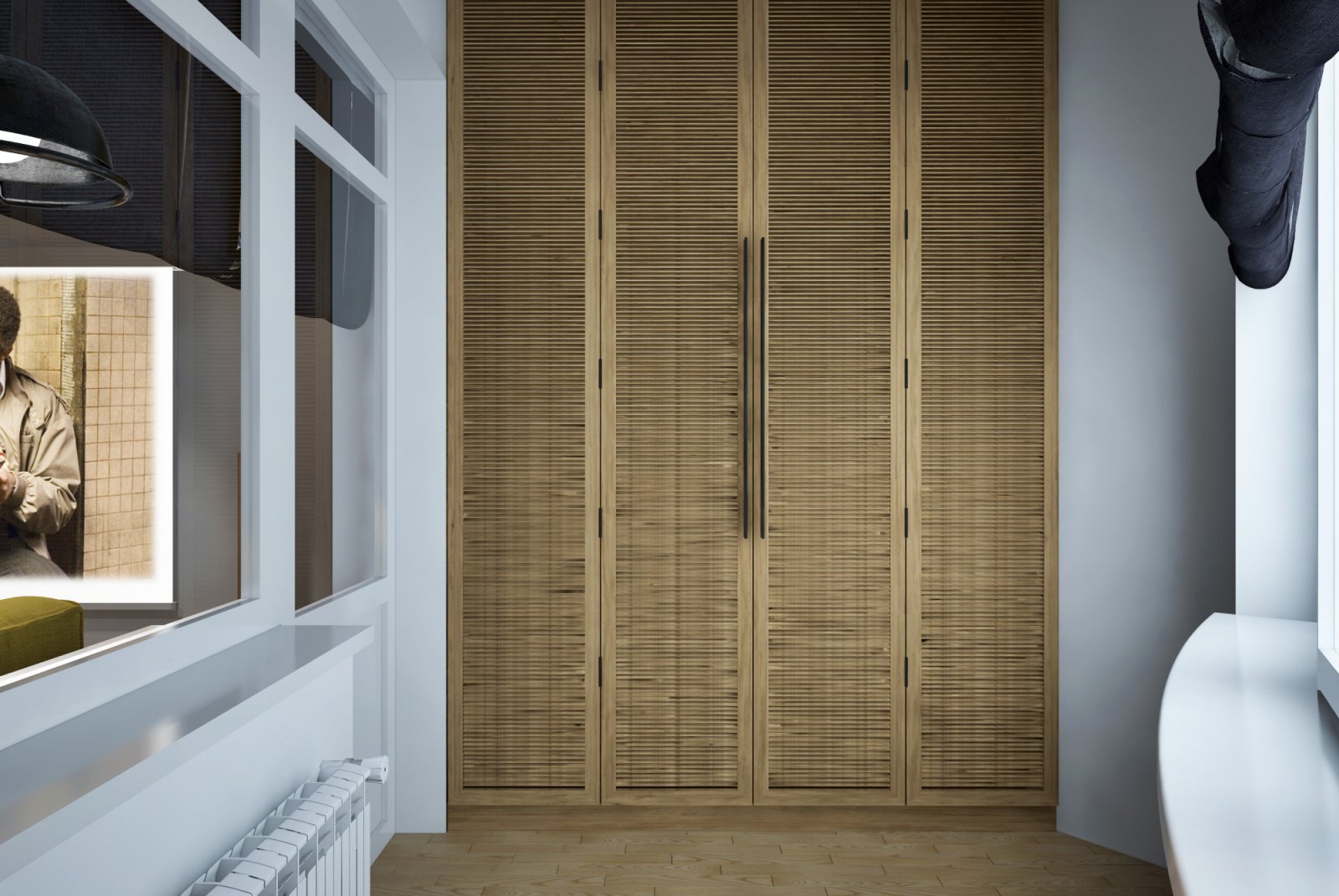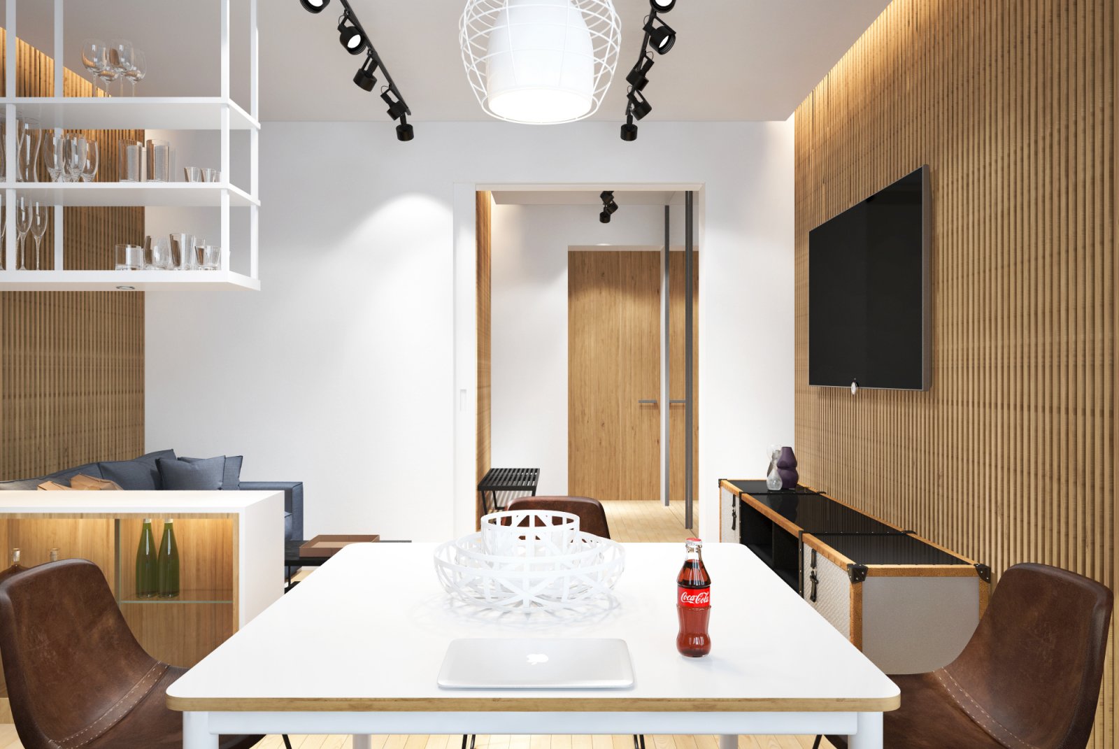 Когда я спросил у него с чем ассоциируется его квартира, он не задумываясь ответил - с берлогой. С этого и началась наша работа над проектом... :-) Главная задача состояла в том, чтобы создать место, где можно отлично провести время с друзьями. Основным местом для отдыха выбрали комнату студио, где можно делать коктейли, слушать музыку, танцевать и играть в настольные игры. Вторым местом был выбран кабинет, где можно посмотреть фильм на проекторе и уединиться от шумной компании на удобном диване. Конечно, когда друзья уходят, квартира приобретает вид «берлоги», где можно впасть в «спячку». За активным отдыхом следует пассивный. Белые стены, много дерева и возможность контролировать освещенность комнат, позволяет создать очень комфортную и расслабляющую атмосферу.