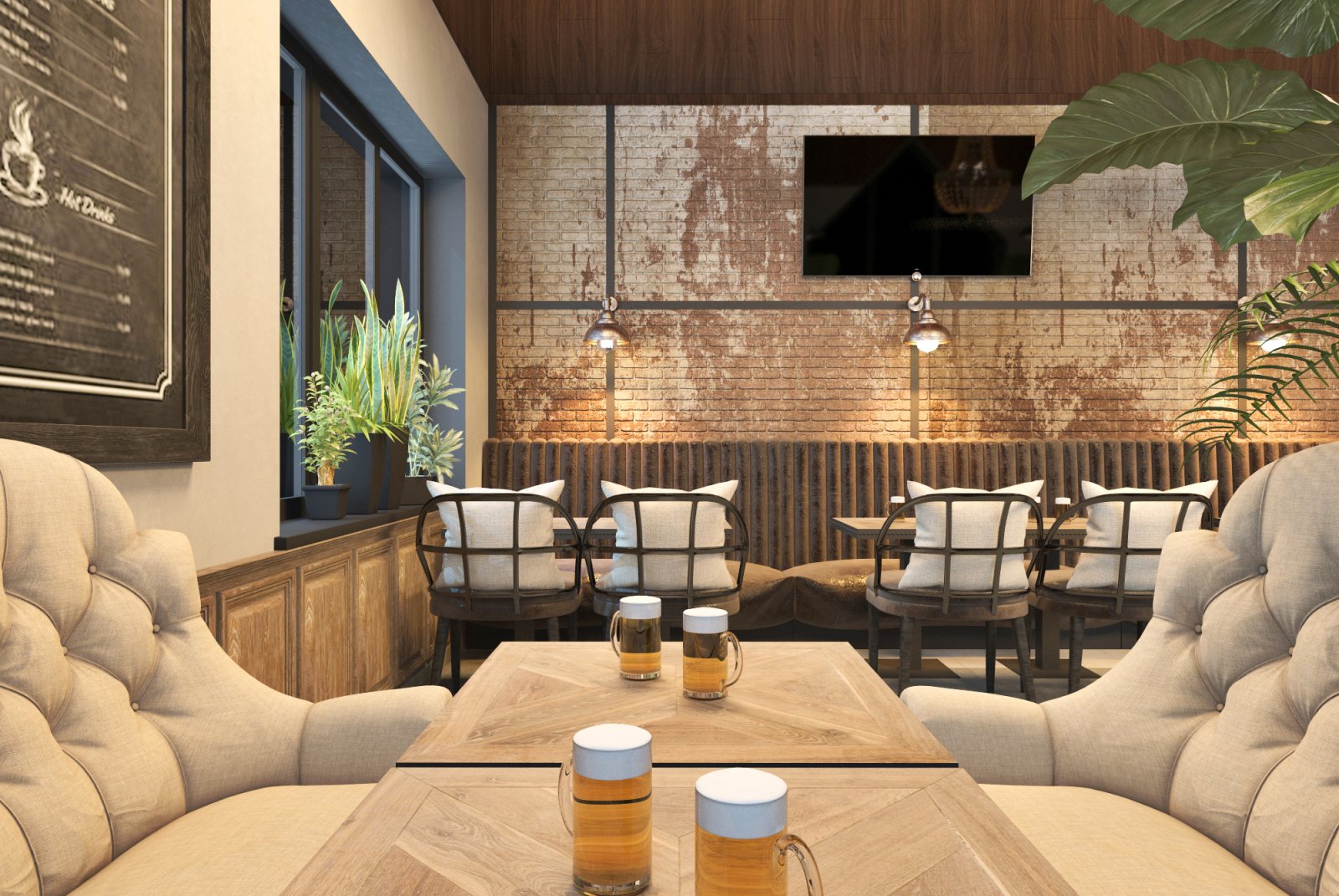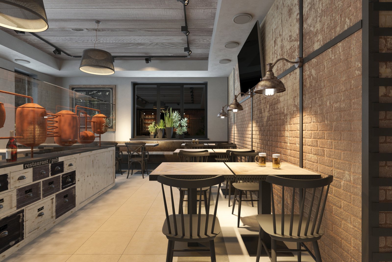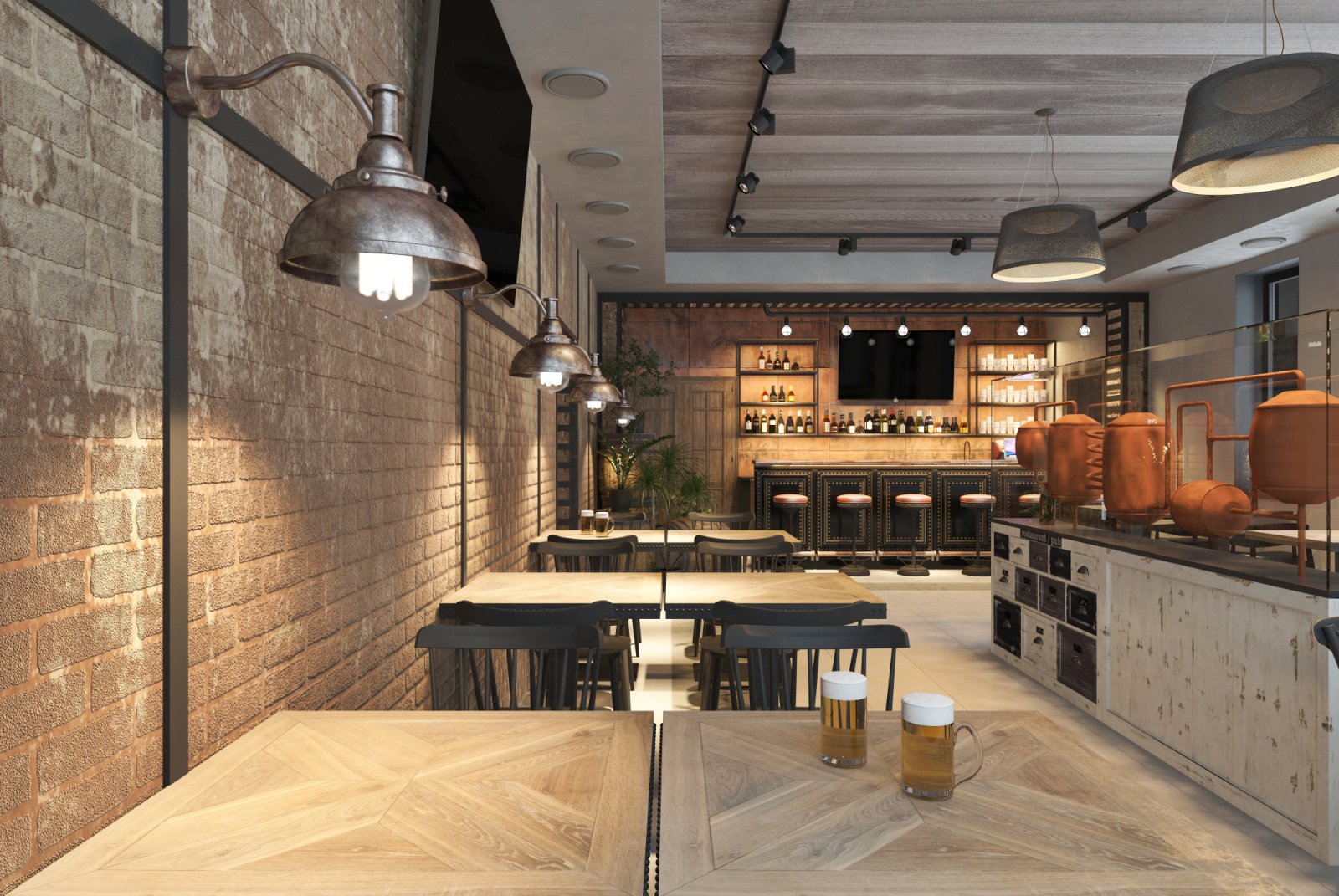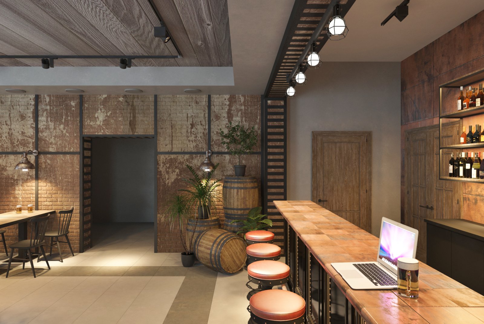 Мой друг построил себе дом. И решил, что в одной части дома он будет жить со своей семьей, а во второй принимать гостей. Так родилась идея открыть паб «для своих». Во Львовской области многие жители очень любят смотреть футбол за бокалом вкусного пива в большой и шумной компании. Паб с большими телевизорами и уютной атмосферой подойдет для этого идеально. Интерьер выполнен в индустриальном стиле с кирпичными и бетонными стенами, металлом и натуральным деревом. Пространство поделено на 2 этажа. На первом этаже гостей встречает длинная барная стойка со столешницей из медных пластин и зал на 32 посадочных места. Второй этаж привлекает гостей множеством мягких диванов и прекрасным видом из окон, готовый вместить еще 28 человек.