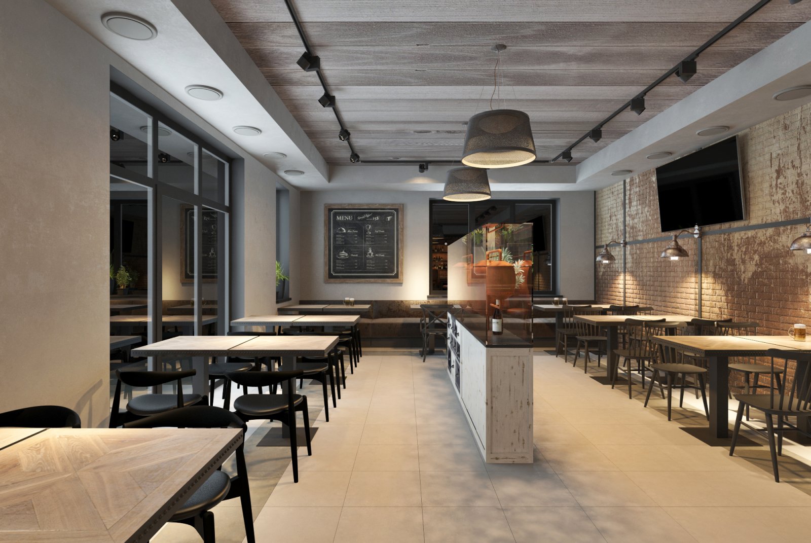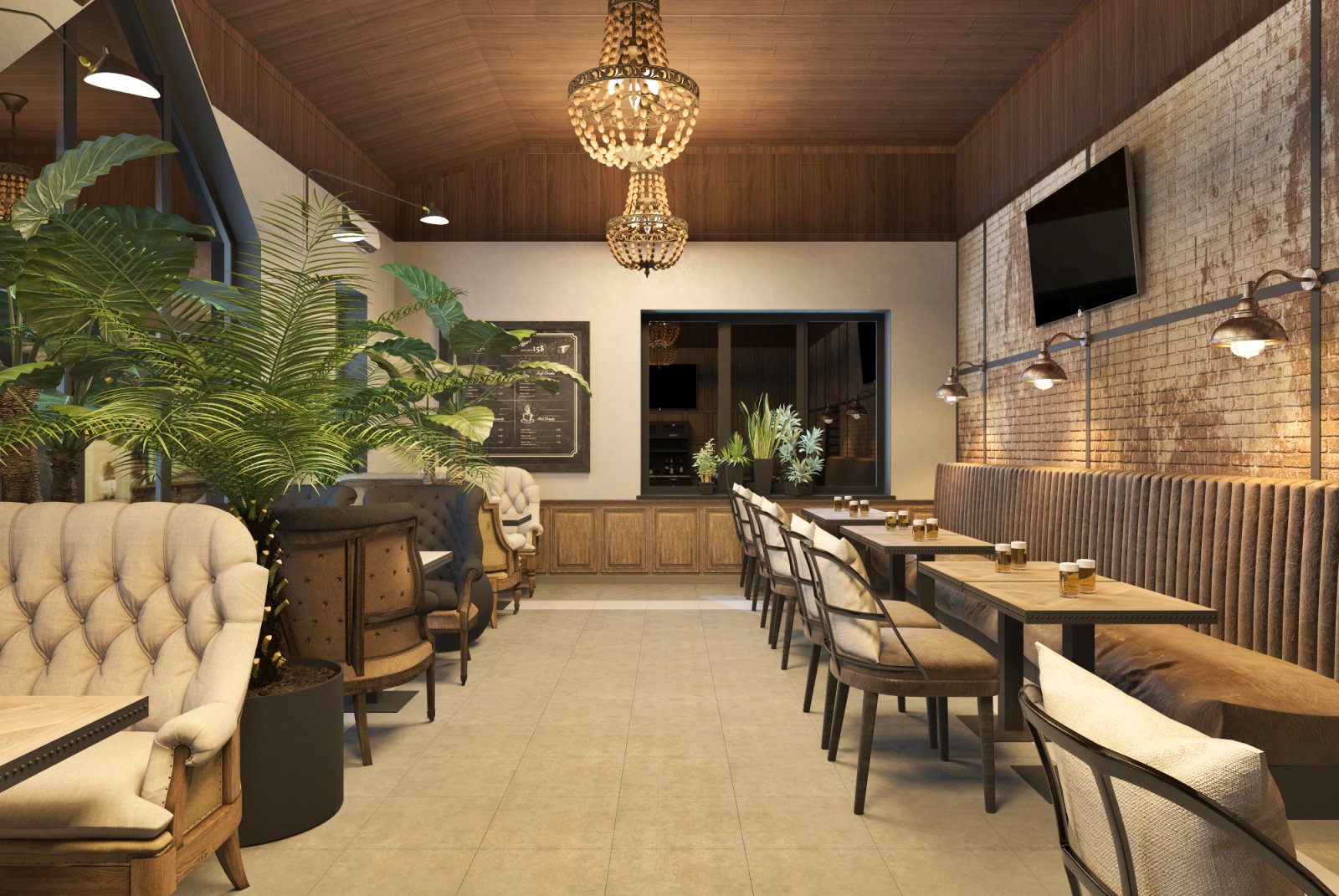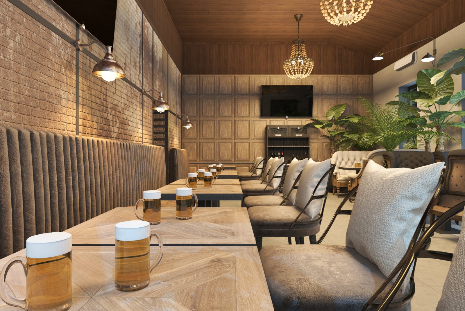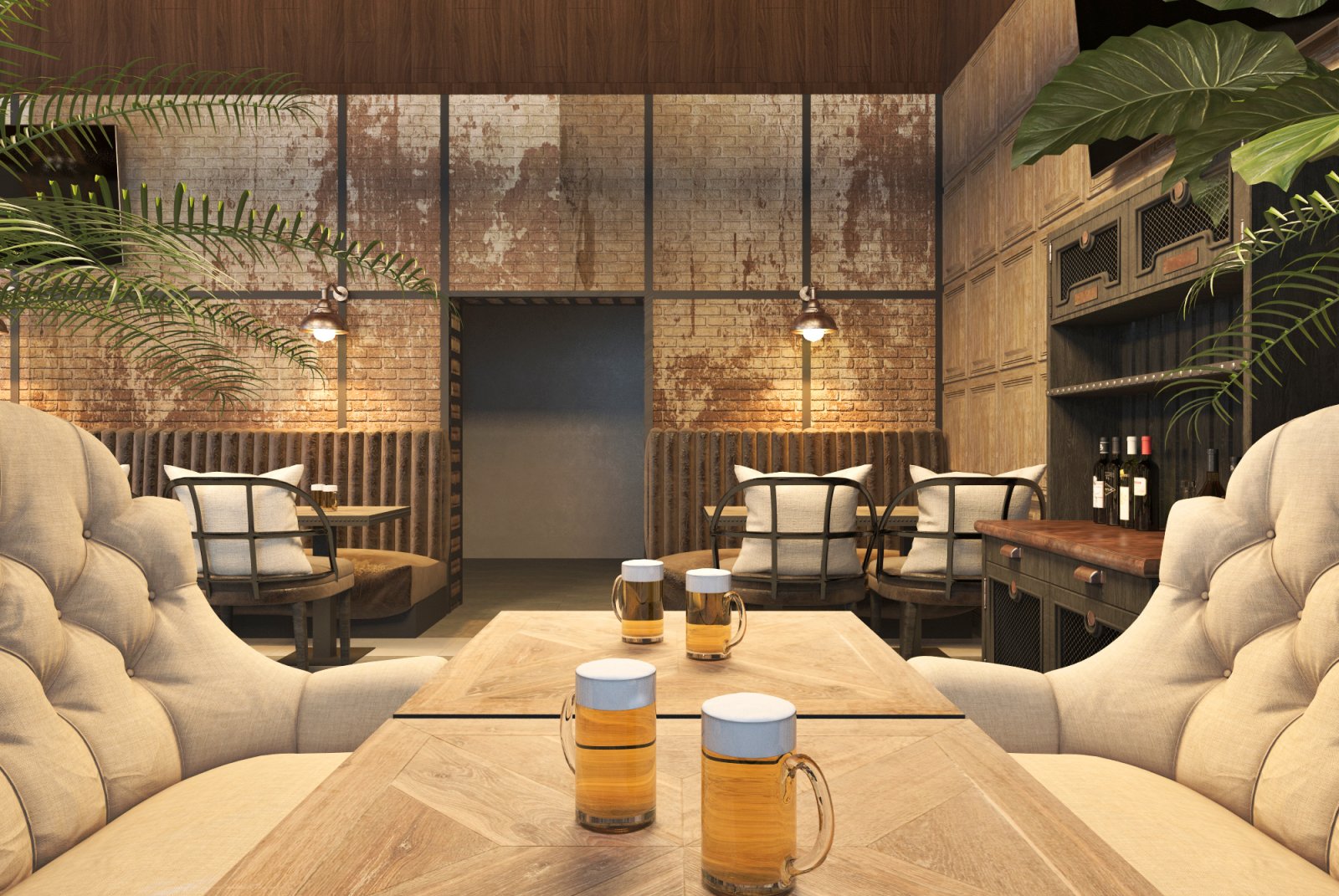 Мой друг построил себе дом. И решил, что в одной части дома он будет жить со своей семьей, а во второй принимать гостей. Так родилась идея открыть паб «для своих». Во Львовской области многие жители очень любят смотреть футбол за бокалом вкусного пива в большой и шумной компании. Паб с большими телевизорами и уютной атмосферой подойдет для этого идеально. Интерьер выполнен в индустриальном стиле с кирпичными и бетонными стенами, металлом и натуральным деревом. Пространство поделено на 2 этажа. На первом этаже гостей встречает длинная барная стойка со столешницей из медных пластин и зал на 32 посадочных места. Второй этаж привлекает гостей множеством мягких диванов и прекрасным видом из окон, готовый вместить еще 28 человек.