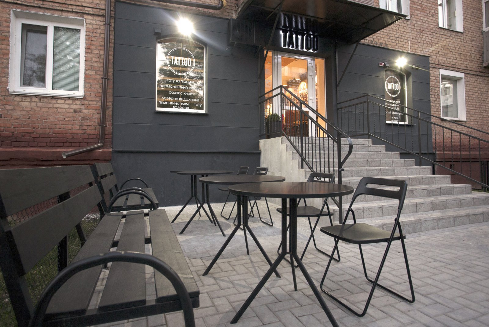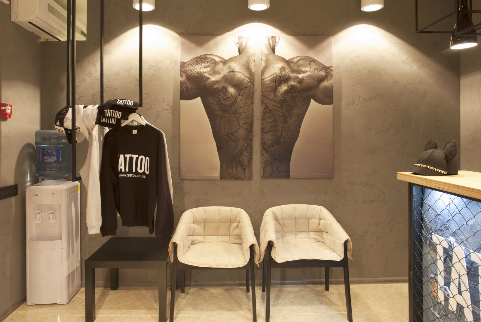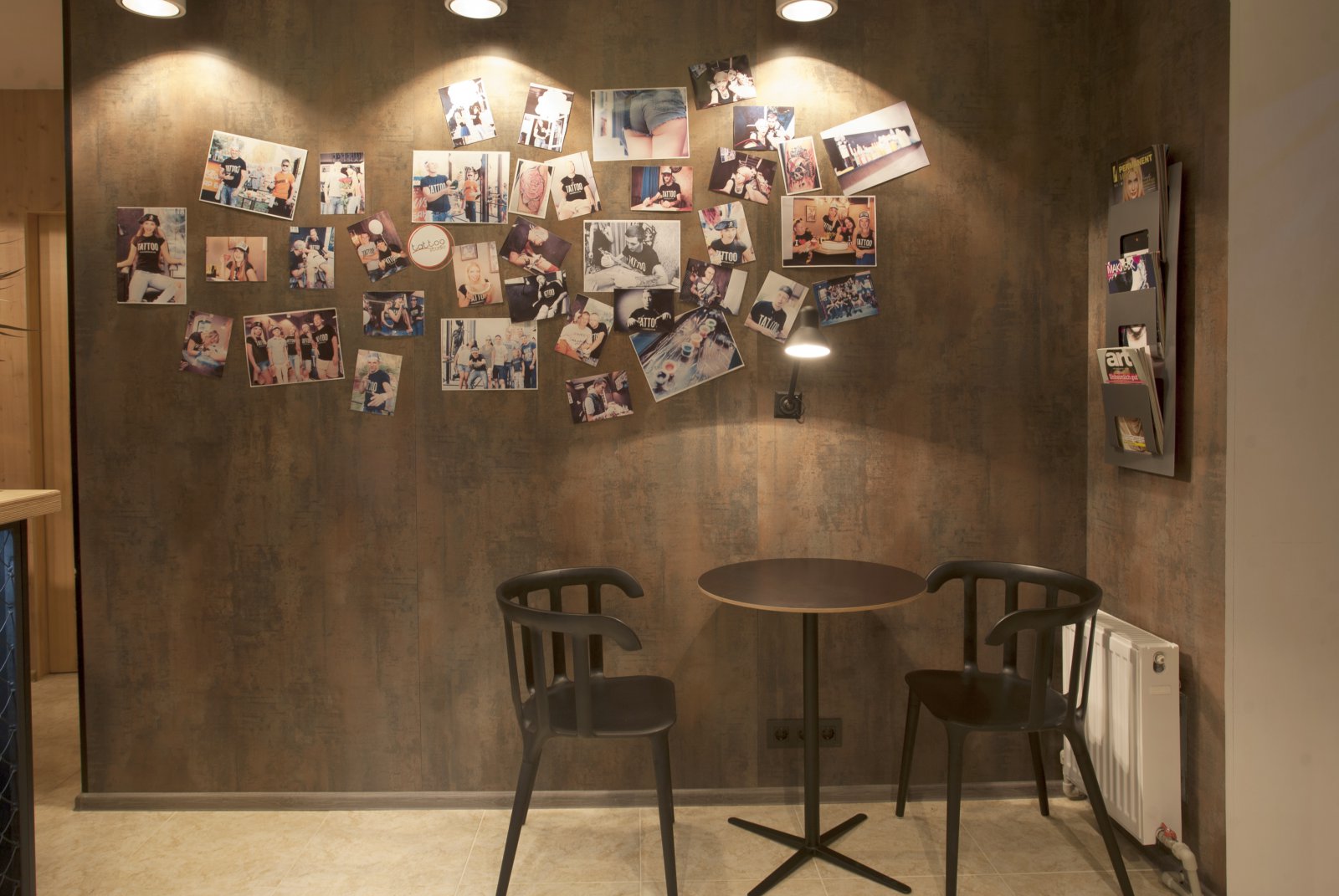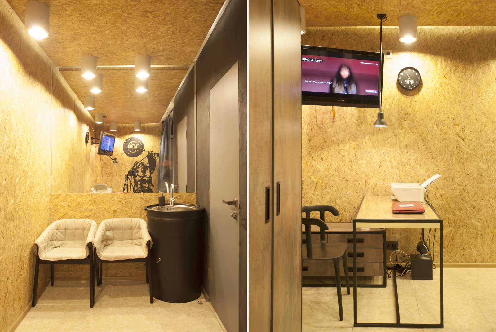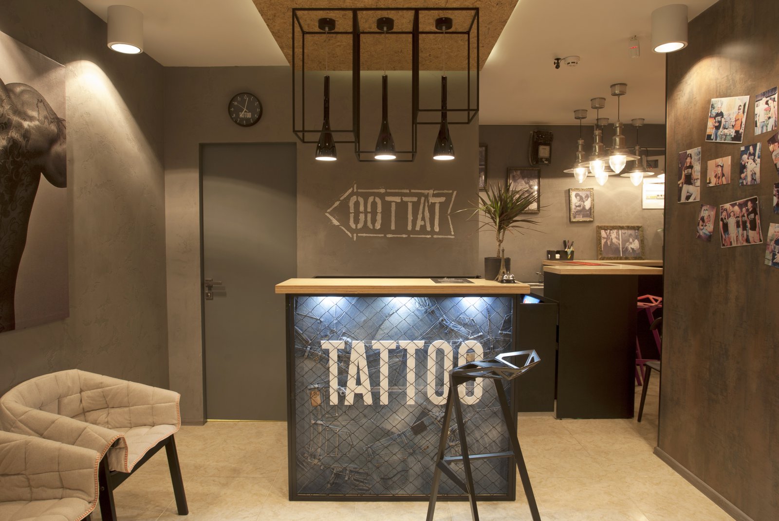 Иногда идеи проекта рождаются в твоей голове, еще до того, как появляется объект, в котором ты можешь их реализовать. Ты еще не знаешь, понадобятся ли они тебе, будут ли реализованы, найдут ли своего клиента… Мне всегда хотелось создать место для творческих людей. Место для людей, у которых много общего. Место, где бы каждый чувствовал себя, как дома. Чтобы оно вдохновляло своей атмосферой и располагало к общению и творчеству. С Александрой Плахтий, хозяйкой данного заведения, мы познакомились случайно в одном из мебельных торговых центров Киева. Пообщавшись, мы поняли, что наши вкусы совпадают и уже через несколько дней мы начали работу над проектом. Основные требования Александры звучали так: креативно, бюджетно и быстро. За креативом в карман лезть не пришлось, так как я уже говорил, идея в моей голове вызревала уже давно. Чтобы проект получился бюджетным, большинство мебели и светильников делались самостоятельно, местными мастерами по моим эскизам. В отделке стен и потолков использовался, мной уже полюбившийся, строительный материал – OSB. И, конечно же, очень нас выручила мебельная компания «IKEA». Кресла и люстры которой, мы привезли из Польши. От нашей первой встречи с Александрой, до открытия «Tattoo studio» прошло всего 2 месяца. И это еще раз подтверждает, что нет ничего невозможного.
